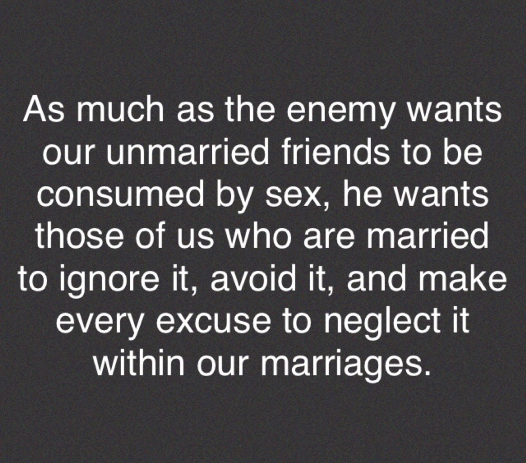 Friend, if you are married, understand this — as much as the enemy wants our unmarried friends to be consumed by sex, he wants those of us who are married to ignore it, avoid it, and make every excuse to neglect it within our marriages. (God created it to be a great, strengthening thing within marriage)
