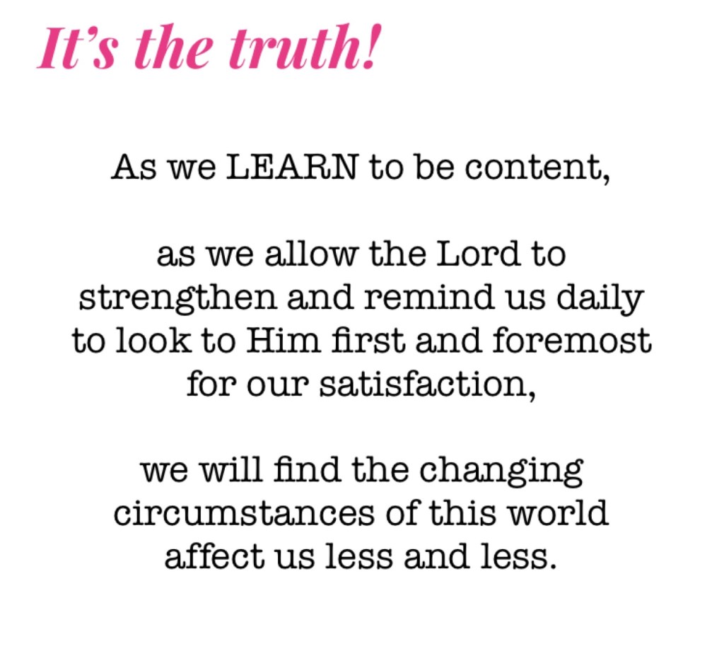 This is a hard thing but not an impossible thing. And as we LEARN to be content, as we allow the Lord to strengthen and remind us daily to look to Him first and foremost for our satisfaction, we will find the changing circumstances of this world affect us less and less.
