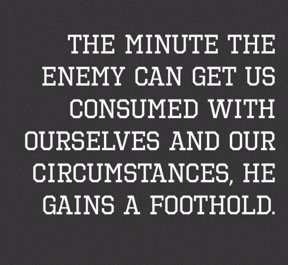 The minute the enemy can get us consumed with ourselves and our circumstances, he gains a foothold.
