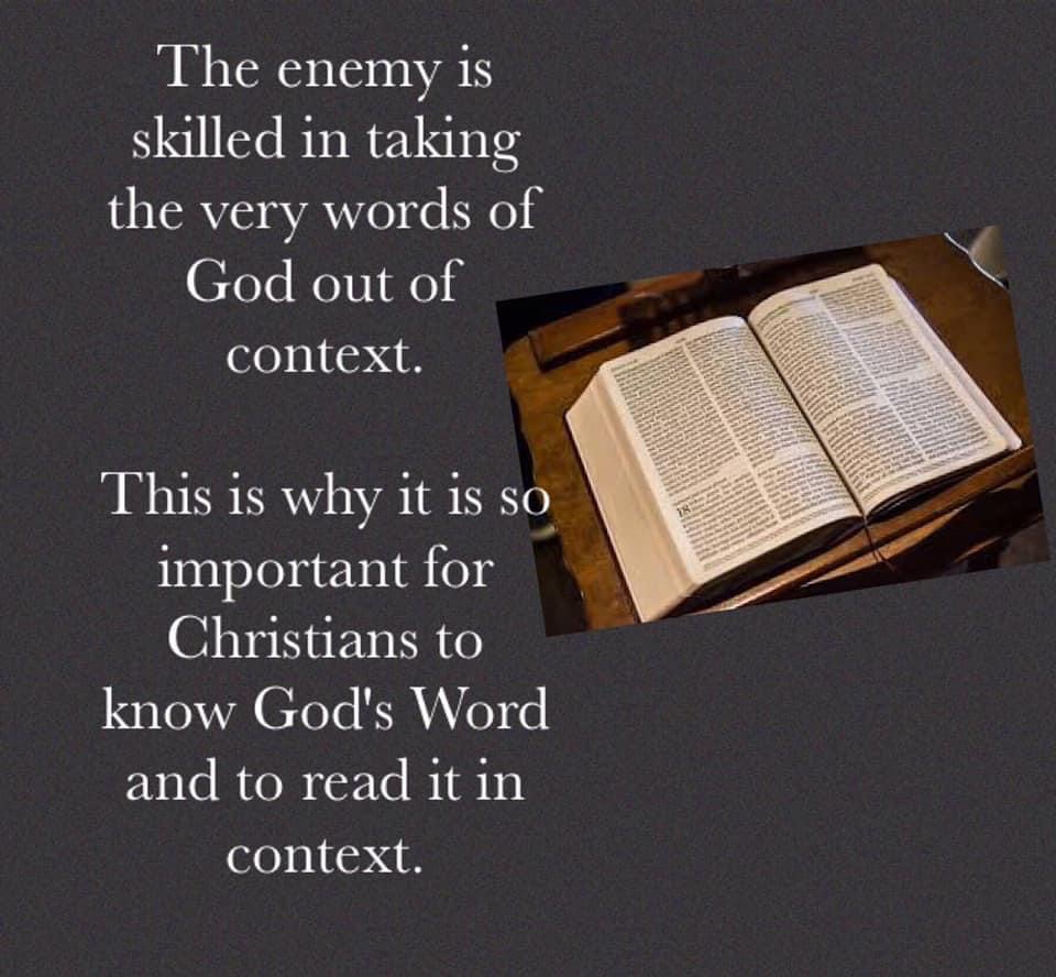 The father of all lies, Satan, is skilled in taking the very words of God out of context. This is why it is so important for Christians to know God’s Word and to read it in context.