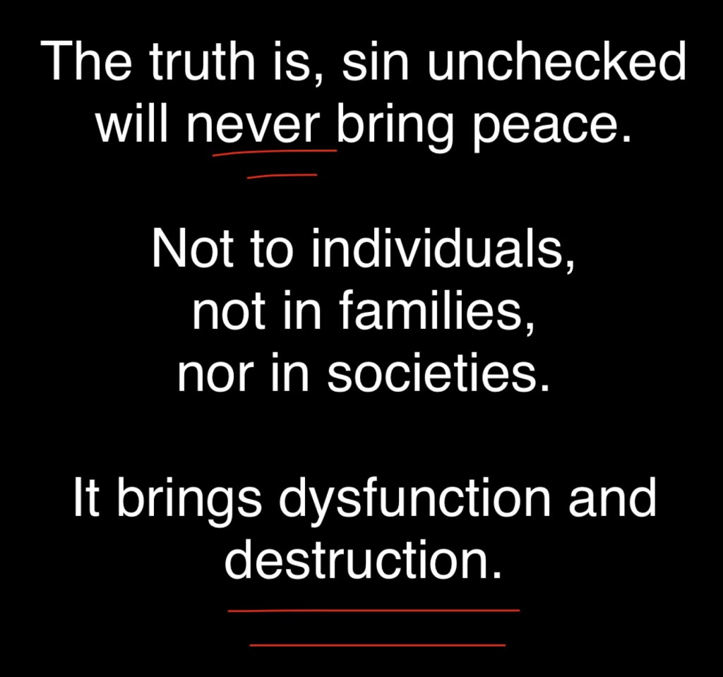 For the truth is, sin unchecked will never bring peace. Not to individuals, not in families, nor in societies. It brings dysfunction and destruction.
