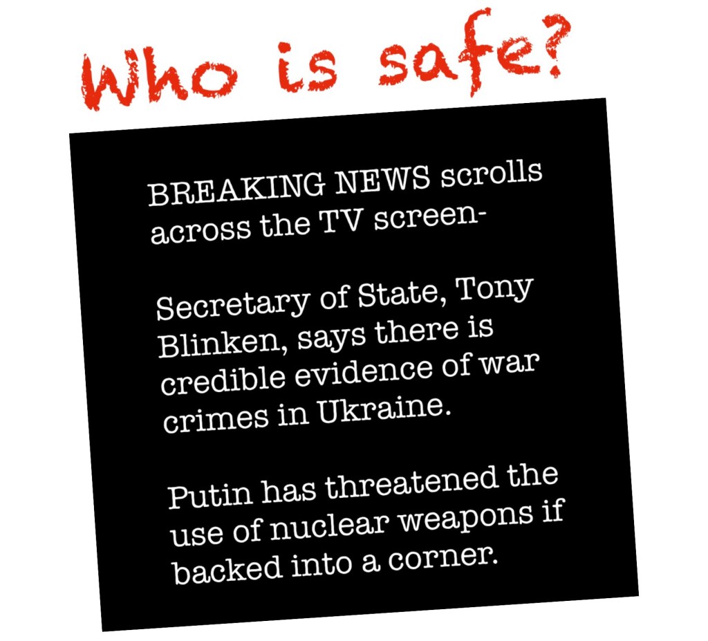 > Kim Jaggers posted: ” Breaking news scrolls across the TV screen- > Secretary of State, Tony Blinken, says there is credible evidence of war > crimes in Ukraine. The White House is now said to be considering a ban on > Russian oil imports. Putin has been threatening the u” >