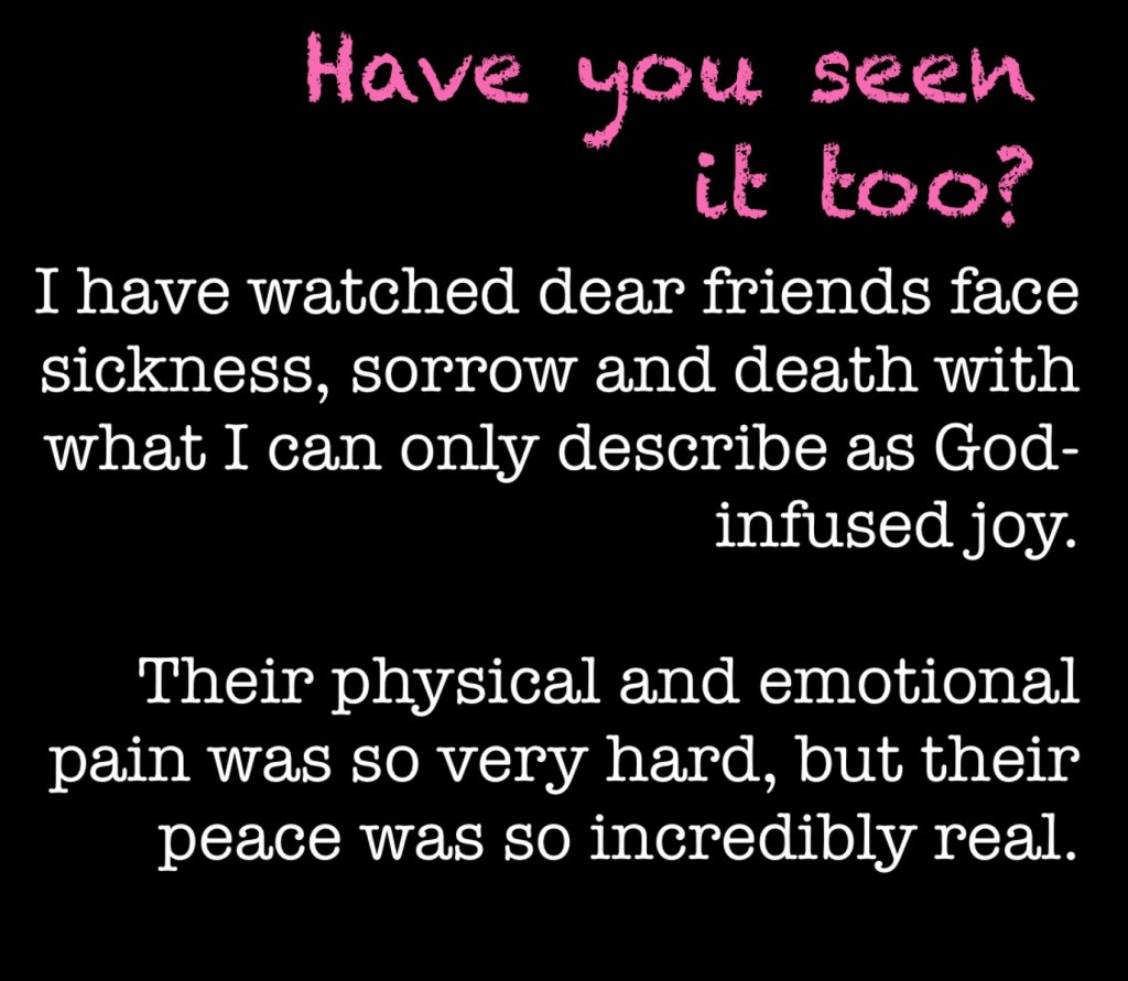 I have watched dear friends face sickness, sorrow and death with what I can only describe as God-infused joy.