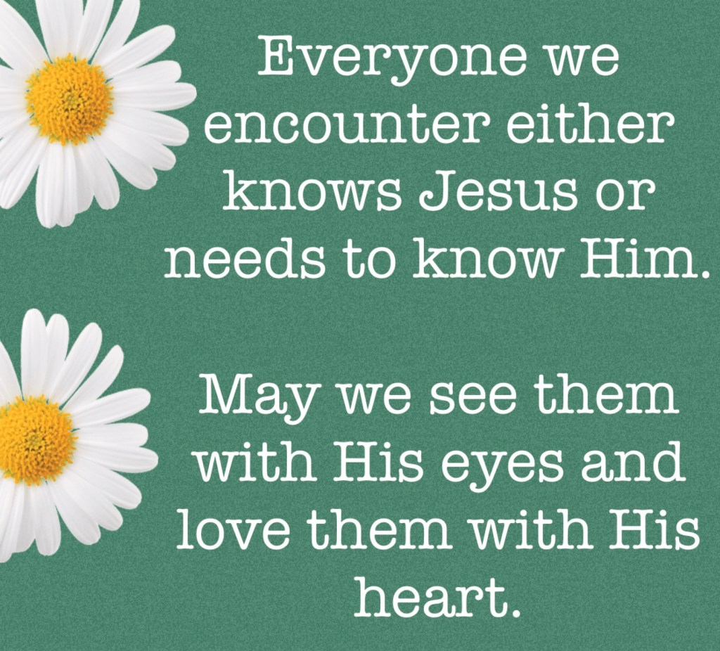 Everyone we encounter either knows Jesus or needs to know Him. May we see them with His eyes and love them with His heart.