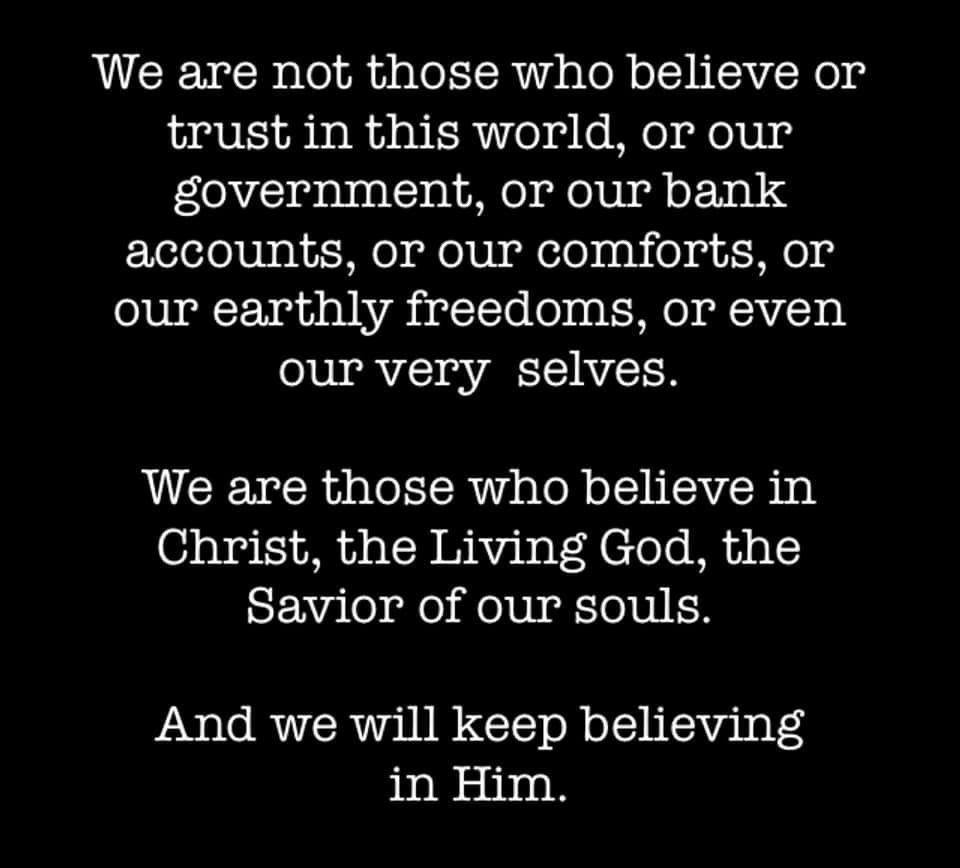 We are not believing or trusting in this world, or our government, or our bank accounts, or our comforts, or our earthly freedoms, or even our very selves.