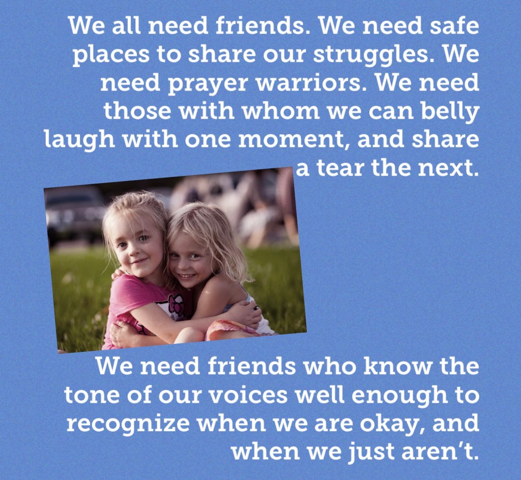 Friends, we all need friends. We need safe places to share our struggles. We need prayer warriors. We need those with whom we can belly laugh with one moment, and share a tear the next.