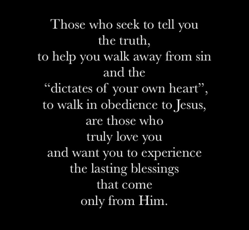 The fact is —Those who seek to tell you the truth, to help you walk away from sin and the “dictates of your own heart”, to walk in obedience to Jesus, are those who truly love you and want you to experience the lasting blessings that come only from Him.