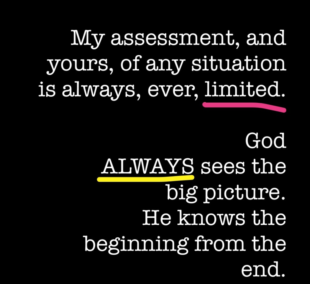 God ALWAYS sees the big picture. He knows the beginning from the end.
