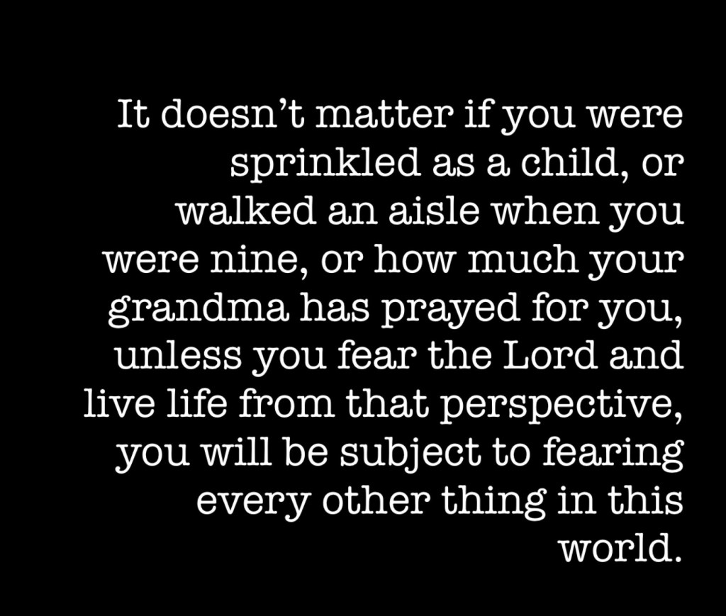 Oh friend, it doesn’t matter if you were sprinkled as a child, or walked an aisle when you were nine, or how much your grandma has prayed for you, unless you fear the Lord and live life from that perspective , you will be subject to fearing every other thing in this world.
