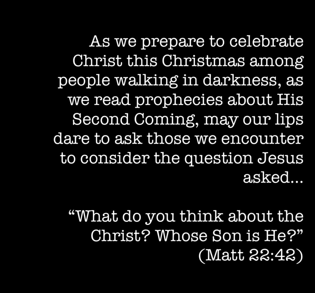 But as we prepare to celebrate Christ this Christmas among people walking in darkness, and as we read prophecies about the Second Coming of Christ, may our lips dare to ask those we encounter to consider the question Jesus asked, “What do you think about the Christ? Whose Son is He?” (Matt 22:42)