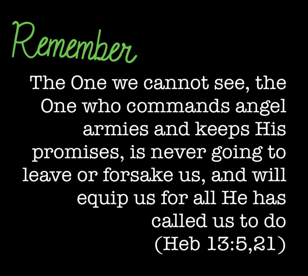 Yes, we are living in some scary days. But God is at work in ways we certainly cannot see. But each day, we can remember the One we cannot see, the One who commands angel armies and keeps His promises is never going to leave or forsake us (Heb 13:5) and will equip us for all He has called us to do (Heb 13:21).
