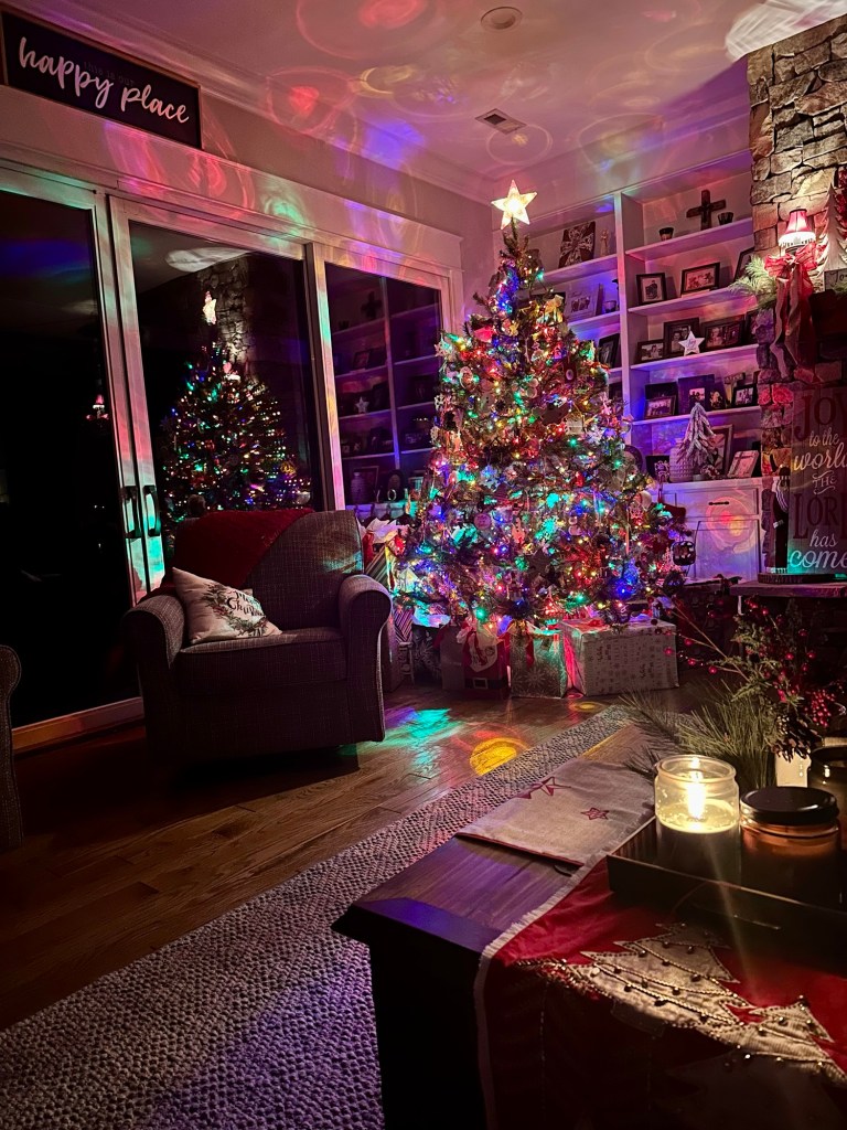 The Christmas tree lights sparkle in the early morning dark. The candle flame dances. The smell of pine and cinnamon fill my home.