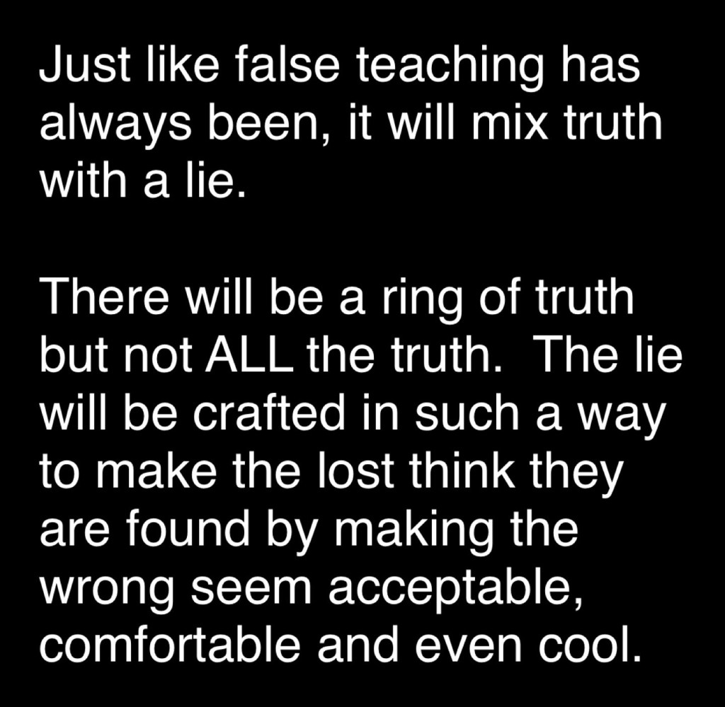 The Bible tells us false teaching will increase in the latter days. And just like false teaching has always been, it will mix truth with a lie. There will be a ring of truth but not all the truth. The lie will be crafted in such a way to make the lost think they are found by making the wrong seem acceptable, comfortable and even cool.