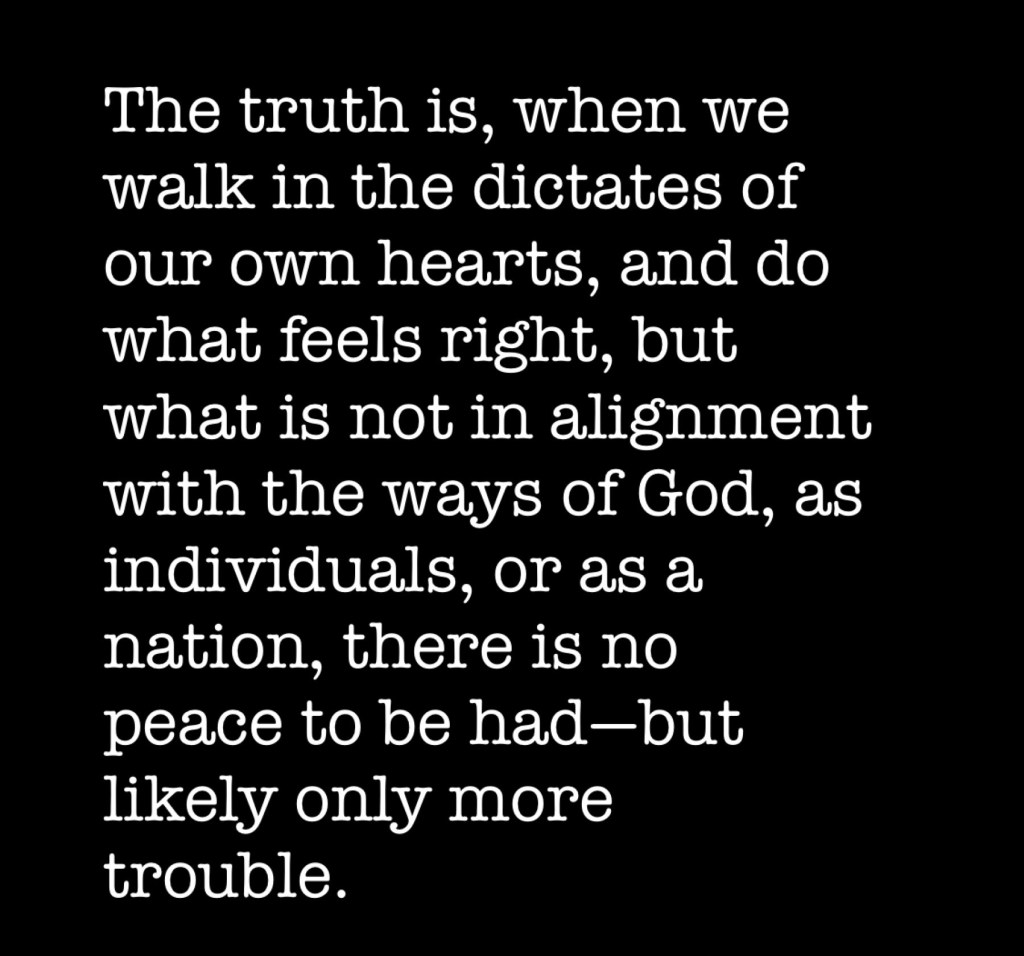 But the truth is, when we walk in the dictates of our own hearts, and do what feels right, but what is not in alignment with the ways of God, as individuals or as a nation, there is no peace to be had—but likely only more trouble.