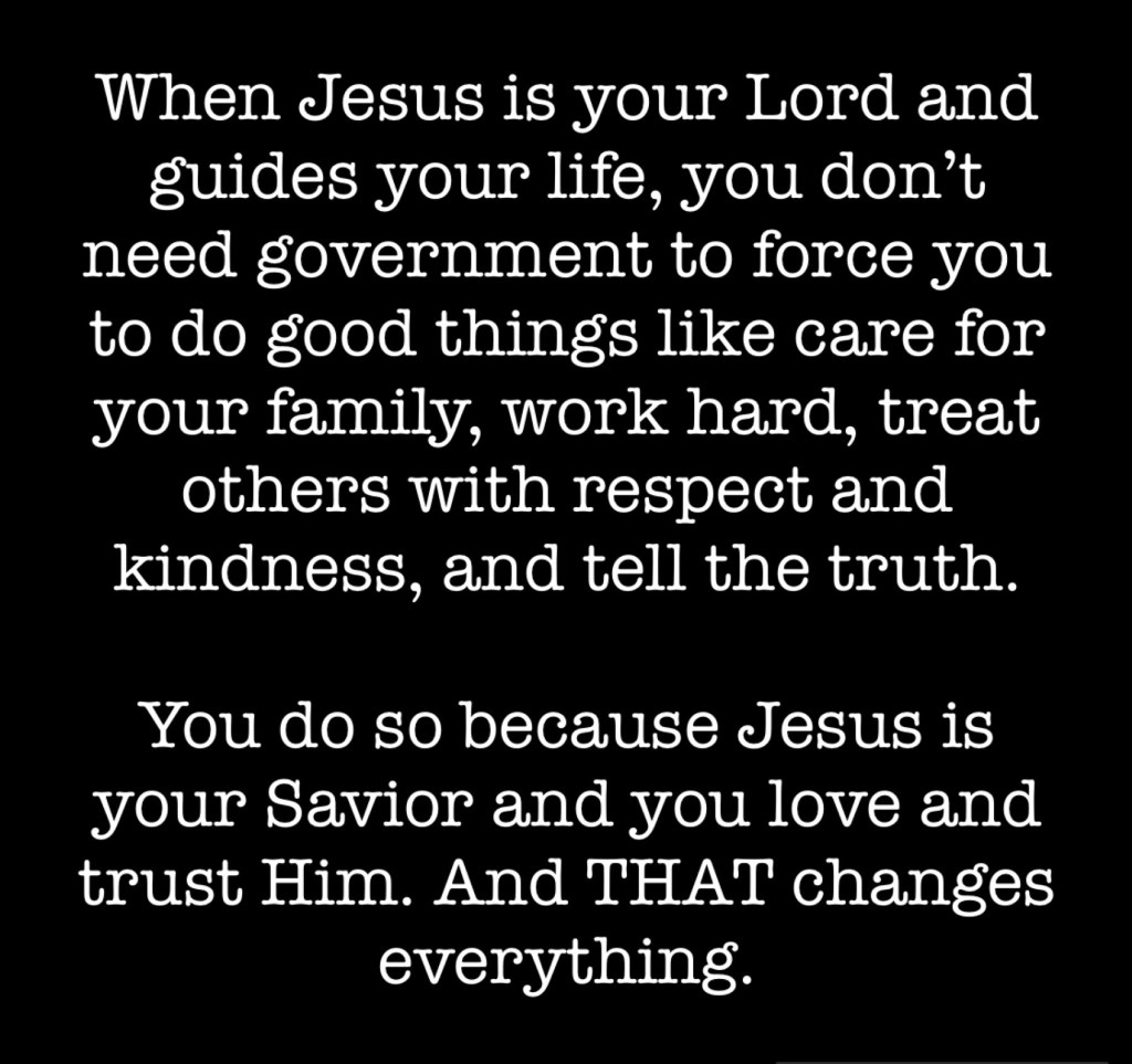 Because when Jesus is your Lord and guides your life, you don’t need government to force you to do good things like care for your family, work hard, treat others with respect and kindness, and tell the truth.
