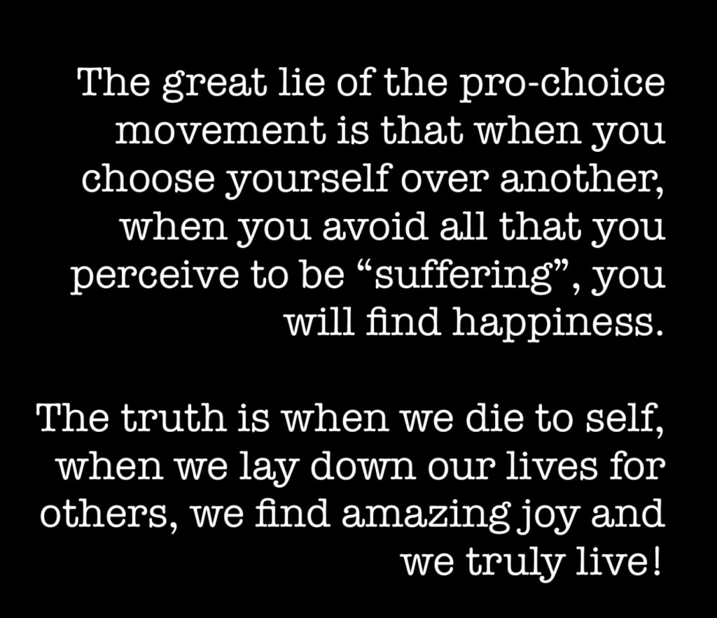 The great lie of the pro-choice movement is that when you choose yourself over another, when you avoid all that you perceive to be “suffering “, you will find happiness.
