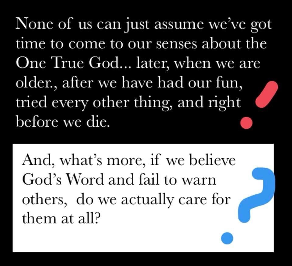 But, I do know none of us can just assume we’ve got time to come to our senses about the One True God… later, when we are older, after we have had our fun, tried every other thing, and right before we die.