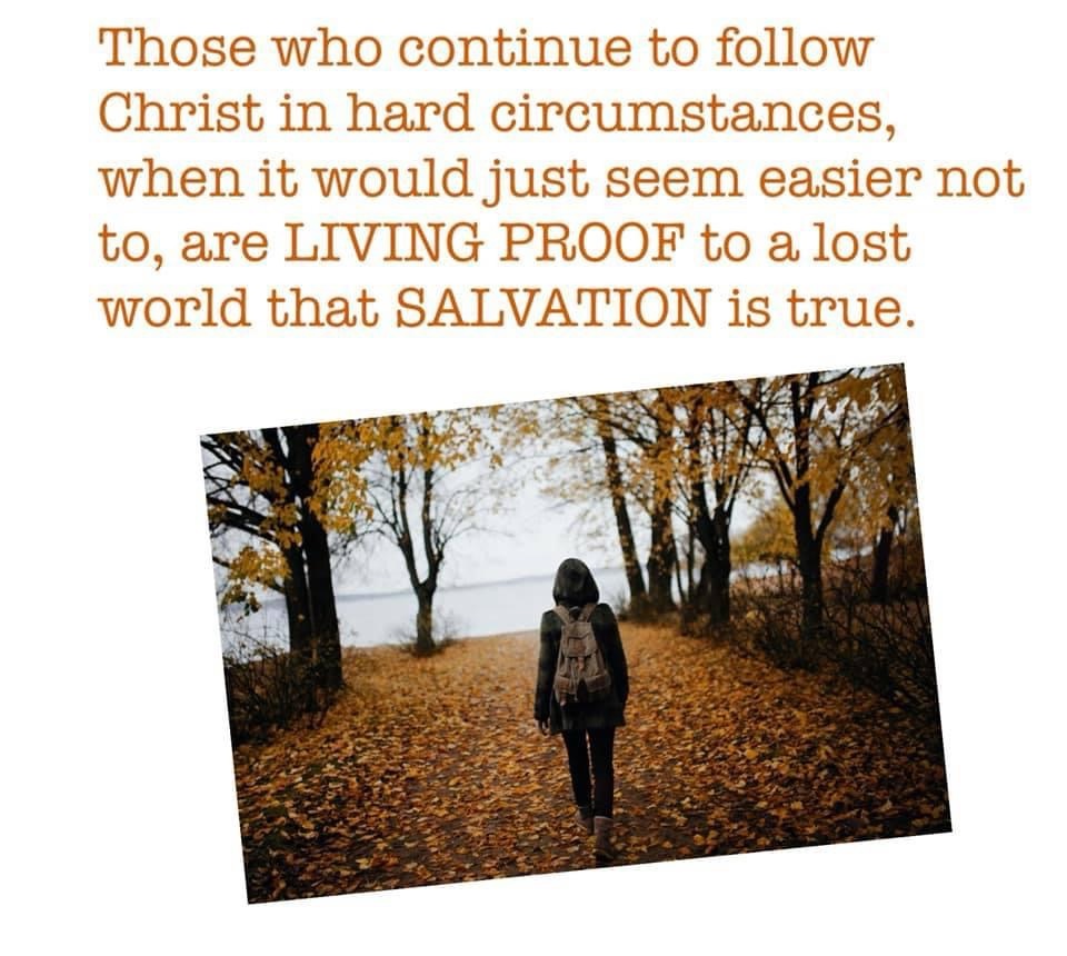 BUT those who continue to follow Christ in hard circumstances, when it would just seem easier not to, are living proof to a lost world that salvation is true. They are walking in faith.
