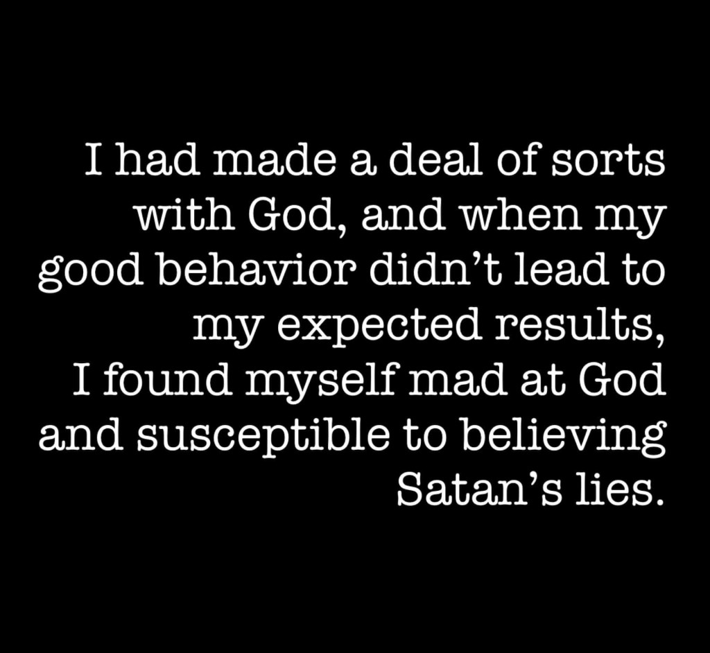 Like many immature churchgoers, without even saying it aloud, I had made a deal of sorts with God, and when my good behavior didn’t lead to my expected results, I found myself mad at God and susceptible to believing Satan’s lies.