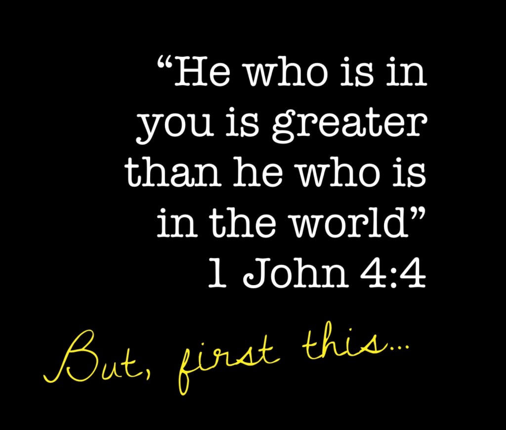 But I can’t just rush to the hope of 1 John 4:4, “He who is in you is greater than he who is in the world” without first reading John’s repeated caution to test every spirit, every voice that is coming at me. (1 John 1-3).