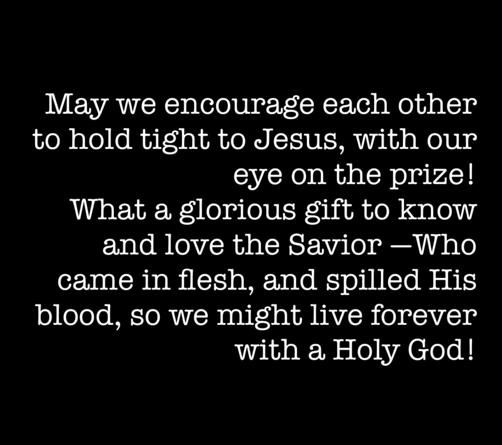 May we keep encouraging each other to hold tight to Jesus, with our eye on the prize! What a glorious prize to know and love the Savior —Who came in flesh and spilled His blood so we might live forever with a Holy God!