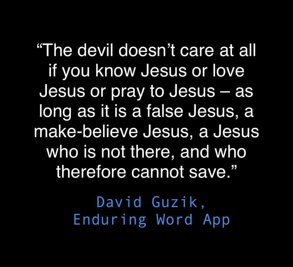 “The devil doesn’t care at all if you know Jesus or love Jesus or pray to Jesus – as long as it is a false Jesus, a make-believe Jesus, a Jesus who is not there, and who therefore cannot save.” – David Guzik, Enduring Word App