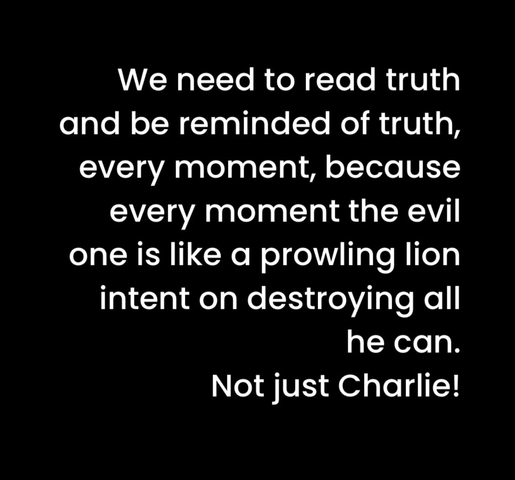 We need to read truth and be reminded of truth, every moment, because every moment the evil one is like a prowling lion intent on destroying all he can. Not just Charlie!