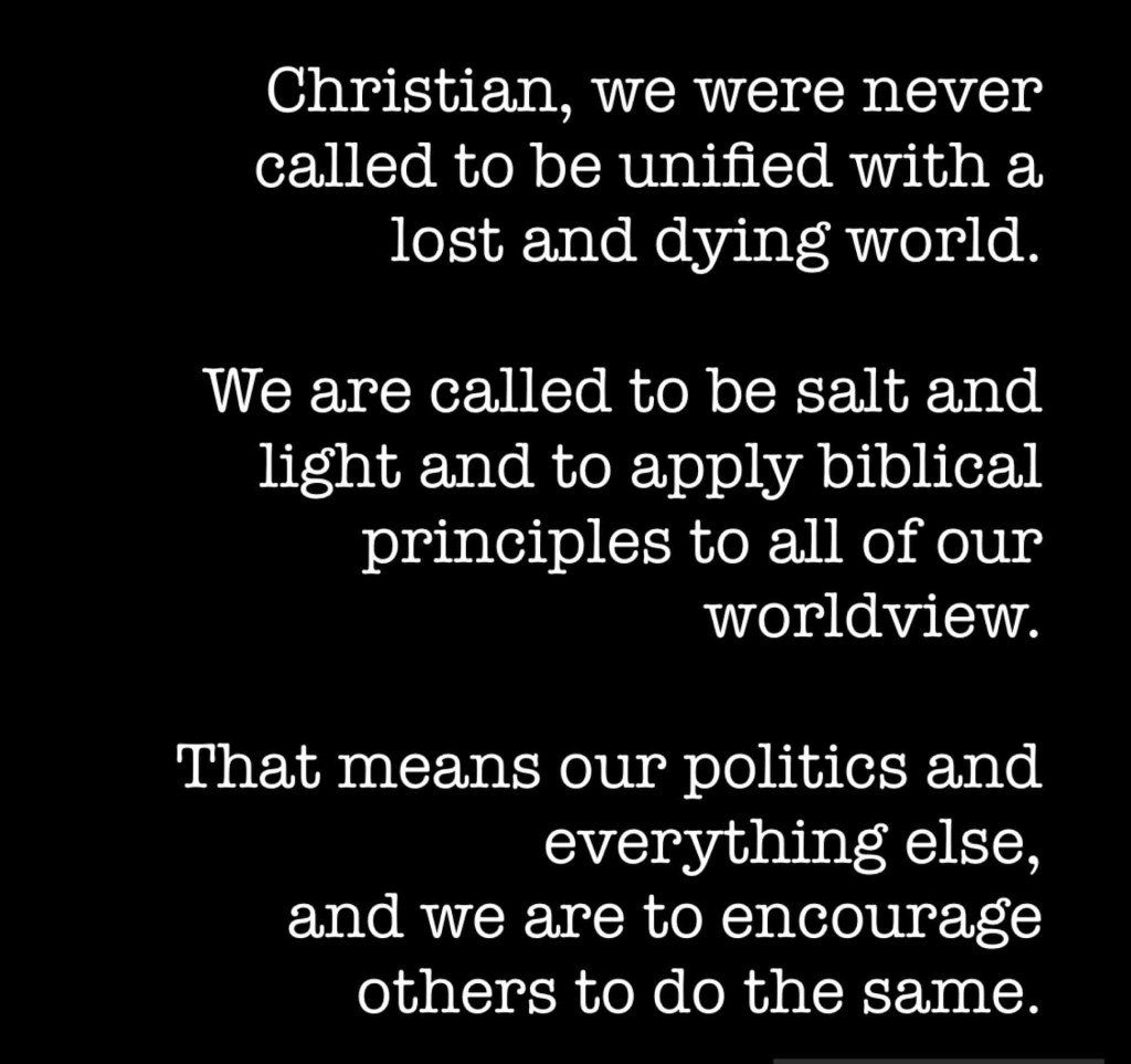 Christian, we were never called to be unified with a lost and dying world. We are called to be salt and light and to apply biblical principles to all of our worldview— that means our politics and everything else— and we are to encourage others to do the same.