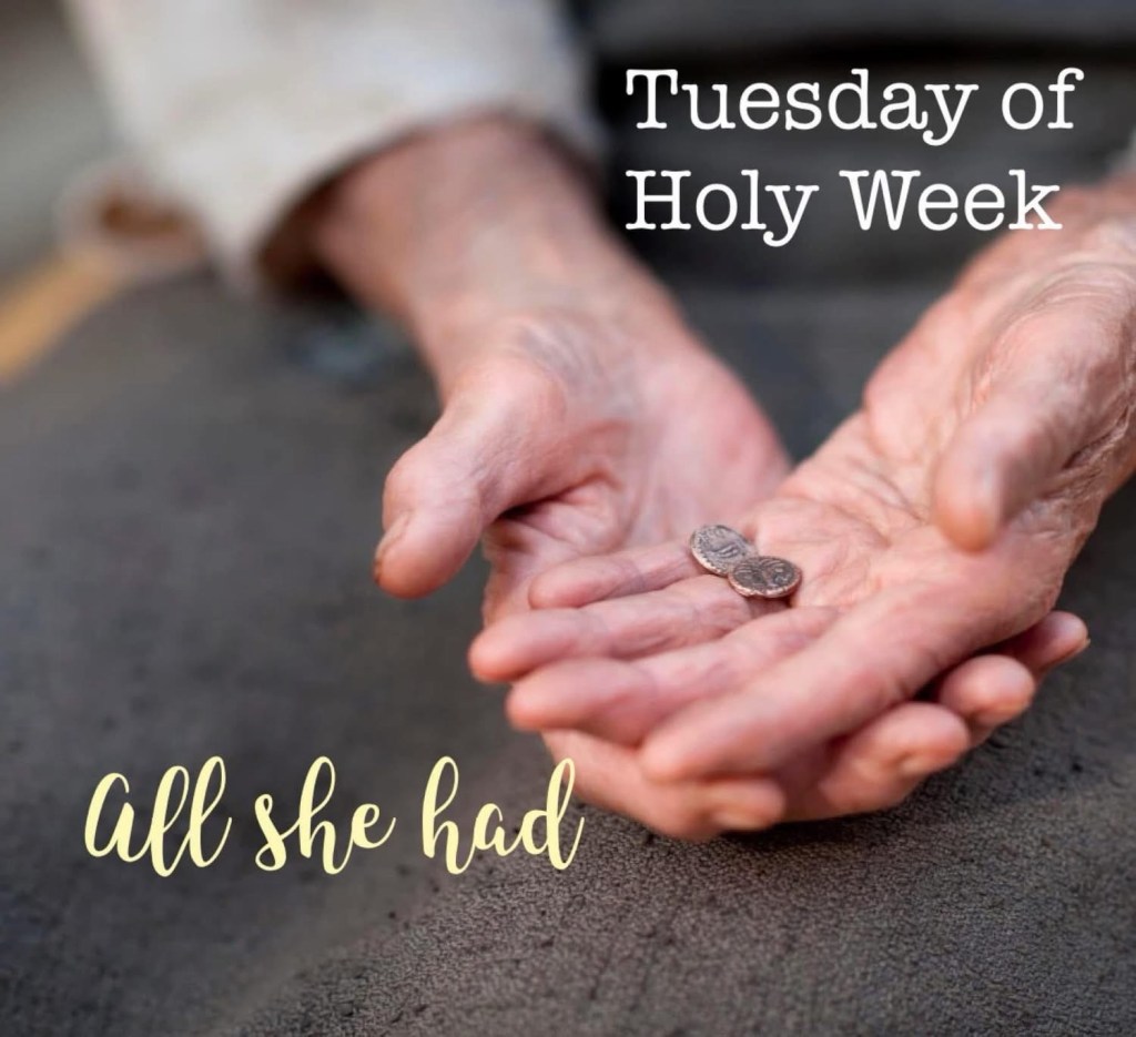 Then, Jesus looks up from their wearisome questions, to see a poor widow putting in two mites at the temple treasury. He says, “Truly, I say to you that this widow has put in more than all, for these out of their abundance have put in offerings for God, but she out of her poverty put in all the livelihood that she had.” (Luke 21:4).