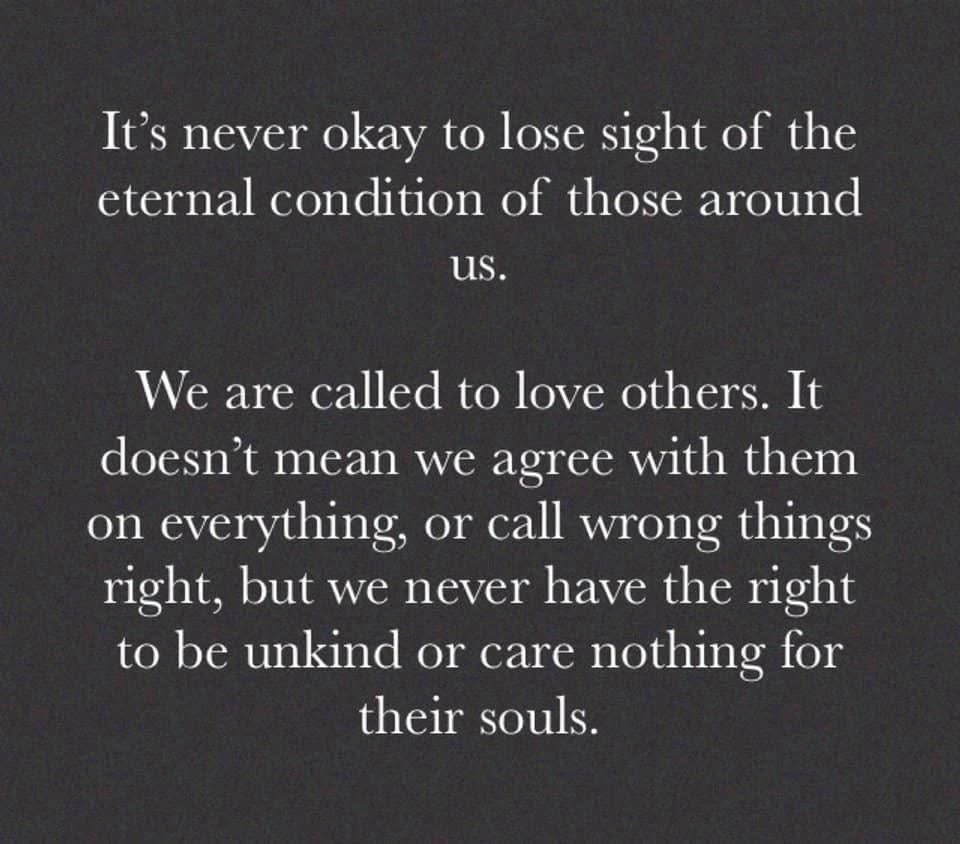 We are called to love others. It doesn’t mean we agree with them on everything, or call wrong things right, but we never have the right to be unkind or care nothing for their souls.